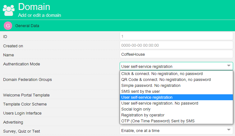 This is the most important setting on domain and it defines the type of registration to the hotspot service.
